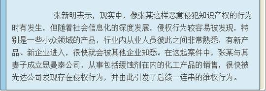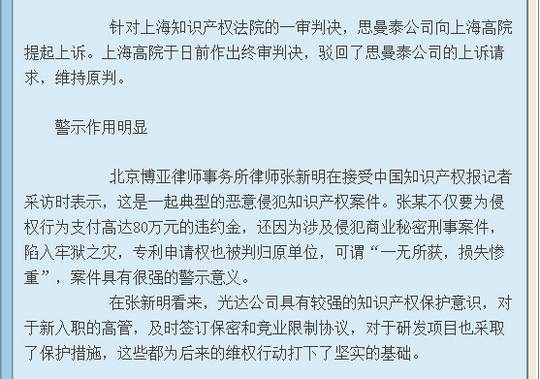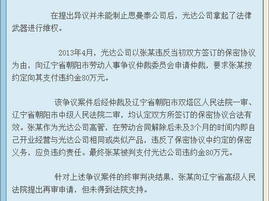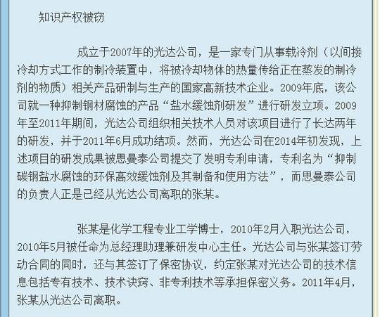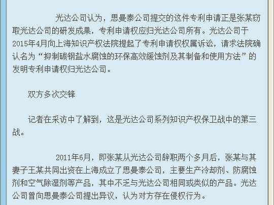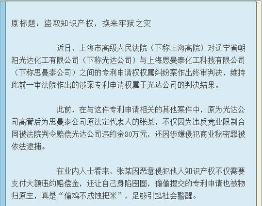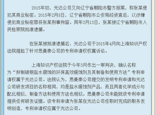近日,上海市高級人民法院(下稱上海高院)對遼寧省朝陽光達化工有限公司(下稱光達公司)與上海思曼泰化工科技有限公司(下稱思曼泰公司)之間的專利申請權(quán)權(quán)屬糾紛案作出終審判決,維持此前一審法院作出的涉案專利申請權(quán)屬于光達公司的判決結(jié)果。在與這件專利申請相關(guān)的其他案件中,原為光達公司高管后為思曼泰公司原法定代表人的張某,不僅因為違反競業(yè)限制合同被法院判令其賠償光達公司違約金80萬元,還因涉嫌侵犯商業(yè)秘密罪被依法逮捕。光達公司不認可法院判決,又在遼寧省朝陽市雙塔區(qū)人民法院進行上訴,在2017年8月30日開庭,判決結(jié)果如下: