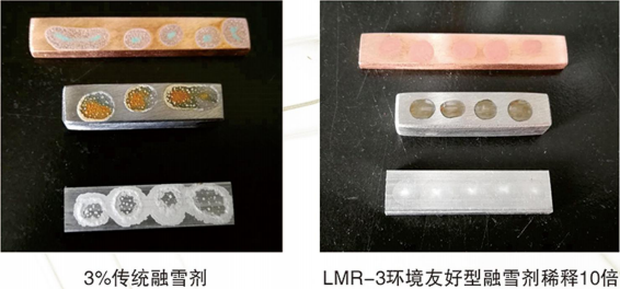 3、防腐蝕性能好,采用M3超膜防銹技術(shù),對碳鋼、銅、鋁合金等金屬幾乎不腐蝕;對瀝青、混凝土路面腐蝕小。LMR-3融雪劑防銹性能見下圖。