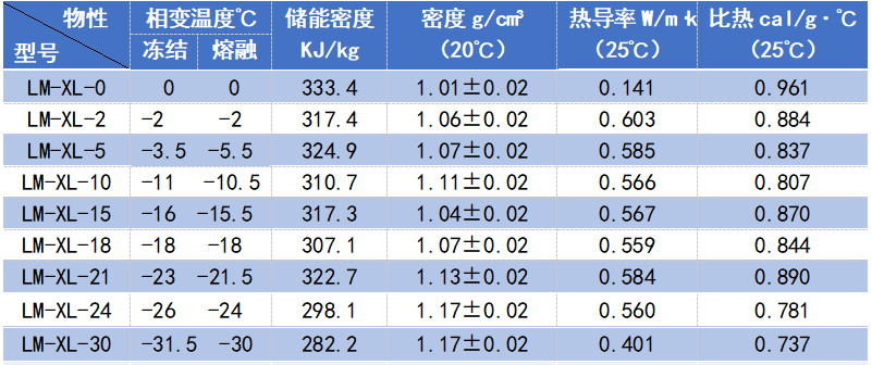 LM-XL系列產(chǎn)品由主儲能劑、相變調(diào)整劑、防過冷劑、防相分離劑、誘發(fā)劑等多組分復(fù)合制備而成。本品通過液-固-液相態(tài)變化實(shí)現(xiàn)冷能的儲存和釋放,具有較高的儲能密度及合適的比熱和導(dǎo)熱系數(shù)。本品不易揮發(fā)、安全可靠,可以反復(fù)使用。